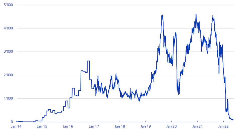 Illustriert wird dies mit der Anzahl Anleihen mit negativer Rendite im breiten Referenzindex Bloomberg Global Aggregate. Dieser Index enthält keine unterjährigen Anleihen, was bei Bond-Indizes üblich ist. Die Anzahl überjähriger Anleihen mit negativer Rendite auf Verfall ist seit August 2021 von knapp 4'600 auf noch ungefähr 100 gefallen.
