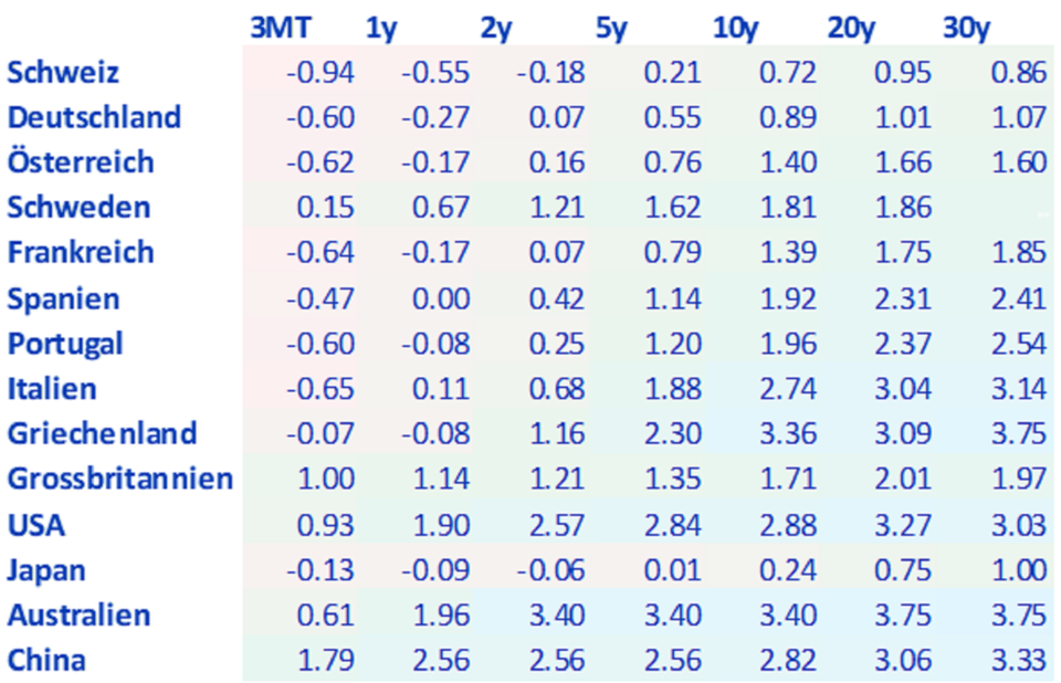 Die bereits erfolgten und weiter zu erwartenden Zinserhöhungen hatten bereits starke Auswirkungen auf die weltweiten Zinskurven. Auch wenn die unterjährigen Zinsen in vielen Ländern noch klar negativ rentieren, notieren viele längere Staatsanleihen mittlerweile wieder auf sehr attraktiven Niveaus.