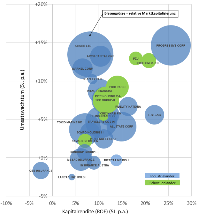 Umsatzwachstum und Kapitalrenditen (ROE) von Nichtleben-Versicherungsfirmen in Industrie- vs. Schwellenländern