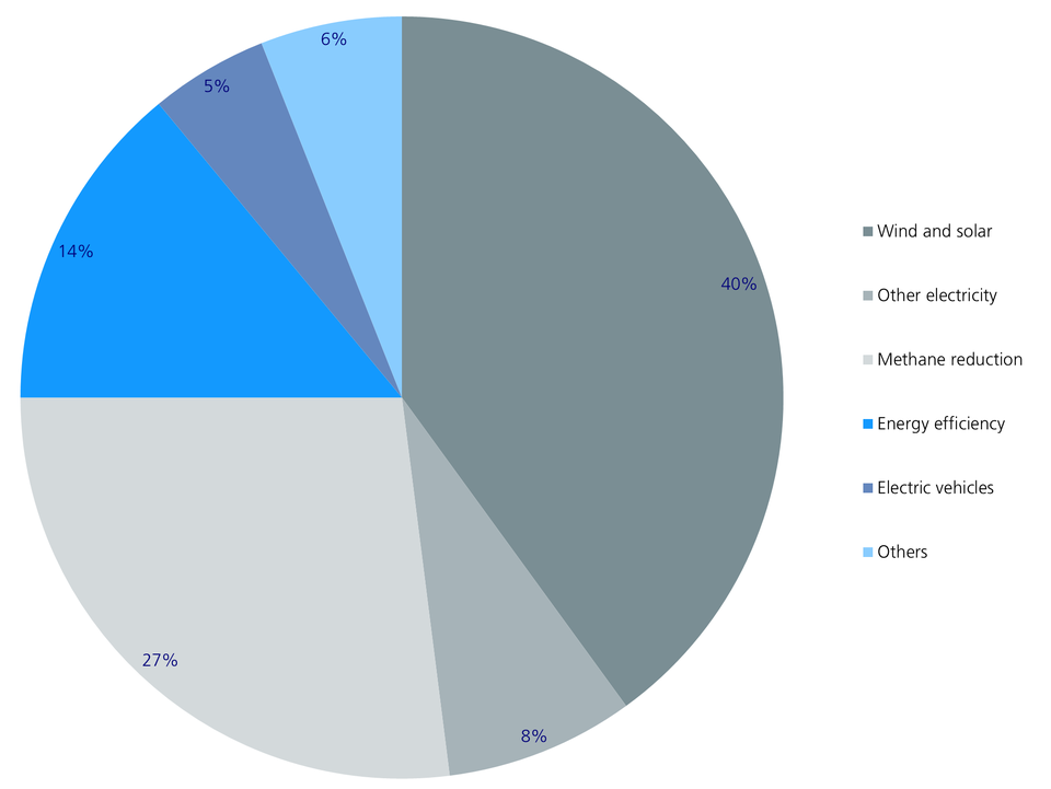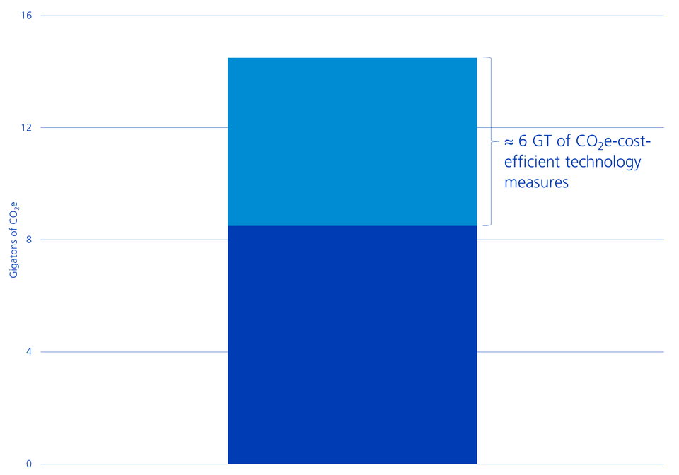 Nonetheless, around 40% or 5.6 GT could be saved with technologies that already appear cost-efficient or deflationary. These include electricity generation from wind and the sun, electromobility and numerous energy efficiency technologies.